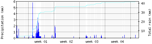 Das blaue Histogram zeigt die totale Niederschlagsmenge (oder deren Wassergehalt) in mm während des Messintervals. |