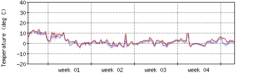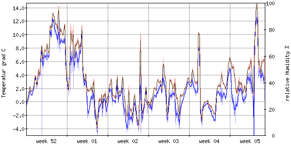 Die rote Kurve zeigt die Temperatur, die hellrote Fläche zeigt den Bereich zwischen höchsten und niedrigsten Temperatur während des Messintervals. Die blaue Kurve zeigt den Taupunkt, also die Temperatur, bei der sich Tau zu bilden beginnt. |