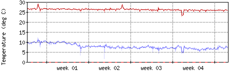Die rote Kurve zeigt die Innentemperatur,die hellrote Fläche zeigt den Bereichh zwischen höchster und tiefster Temperatur während des Messzeitraums. |