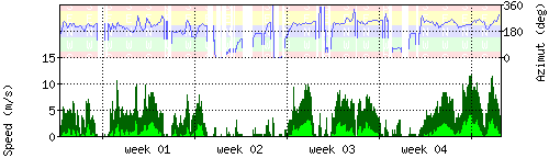 Der untere Teil des Graphen zeigt in hellgrün die mittlere Windgeschwindigkeit, die Spitzengeschwindigkeit ist dunkelgrün dargestellt, die zugehörige Skala findet sich am linken Rand. Der obere Teil des Graphen zeigt das Wind-Azimut in blau, die Skala steht am rechten Rand. |