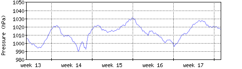 Der blaue Graph zeigt den mittleren Luftdruck, der Bereich zwischen grösstem und kleinstem Druck während des Messintervals ist in hellblau dargestellt. |