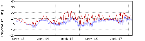Die rote Kurve zeigt die Temperatur, die hellrote Fläche zeigt den Bereich zwischen höchsten und niedrigsten Temperatur während des Messintervals. Die blaue Kurve zeigt den Taupunkt, also die Temperatur, bei der sich Tau zu bilden beginnt. |