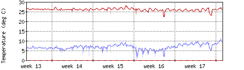 Die rote Kurve zeigt die Innentemperatur,die hellrote Fläche zeigt den Bereichh zwischen höchster und tiefster Temperatur während des Messzeitraums. |