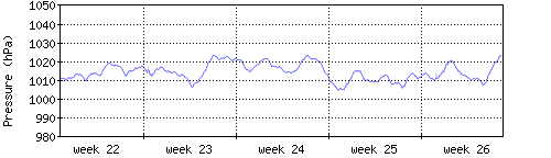 Der blaue Graph zeigt den mittleren Luftdruck, der Bereich zwischen grösstem und kleinstem Druck während des Messintervals ist in hellblau dargestellt. |