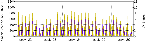 Das goldene Histogramm zeigt die totale Sonnestrahlung in W/m^2, die Skala befindet sich am linken Rand. Die violette Kurve zeigt den UV index, mit der Skala am rechten Rand. Man beachte, dass nach Schneefall die Messwerte nicht zuverlässig sind, weil die Sensoren nicht automatisch vom Schnee befreit werden. |