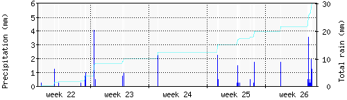 Das blaue Histogram zeigt die totale Niederschlagsmenge (oder deren Wassergehalt) in mm während des Messintervals. |