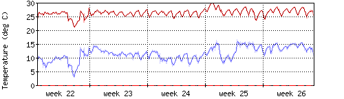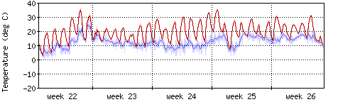Die rote Kurve zeigt die Innentemperatur,die hellrote Fläche zeigt den Bereichh zwischen höchster und tiefster Temperatur während des Messzeitraums. |