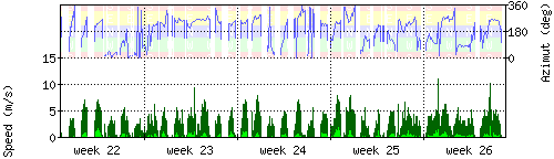 Der untere Teil des Graphen zeigt in hellgrün die mittlere Windgeschwindigkeit, die Spitzengeschwindigkeit ist dunkelgrün dargestellt, die zugehörige Skala findet sich am linken Rand. Der obere Teil des Graphen zeigt das Wind-Azimut in blau, die Skala steht am rechten Rand. |