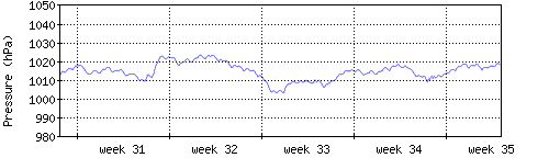 Der blaue Graph zeigt den mittleren Luftdruck, der Bereich zwischen grösstem und kleinstem Druck während des Messintervals ist in hellblau dargestellt. |