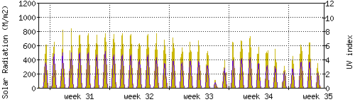 Das goldene Histogramm zeigt die totale Sonnestrahlung in W/m^2, die Skala befindet sich am linken Rand. Die violette Kurve zeigt den UV index, mit der Skala am rechten Rand. Man beachte, dass nach Schneefall die Messwerte nicht zuverlässig sind, weil die Sensoren nicht automatisch vom Schnee befreit werden. |