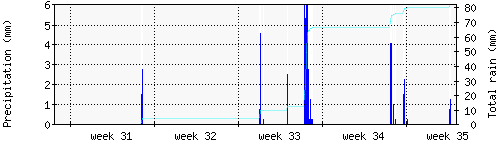Das blaue Histogram zeigt die totale Niederschlagsmenge (oder deren Wassergehalt) in mm während des Messintervals. |