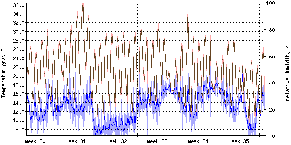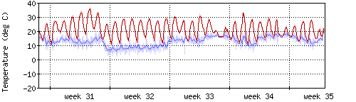 Die rote Kurve zeigt die Temperatur, die hellrote Fläche zeigt den Bereich zwischen höchsten und niedrigsten Temperatur während des Messintervals. Die blaue Kurve zeigt den Taupunkt, also die Temperatur, bei der sich Tau zu bilden beginnt. |
