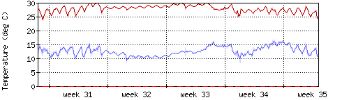 Die rote Kurve zeigt die Innentemperatur,die hellrote Fläche zeigt den Bereichh zwischen höchster und tiefster Temperatur während des Messzeitraums. |