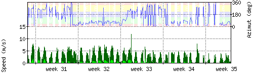 Der untere Teil des Graphen zeigt in hellgrün die mittlere Windgeschwindigkeit, die Spitzengeschwindigkeit ist dunkelgrün dargestellt, die zugehörige Skala findet sich am linken Rand. Der obere Teil des Graphen zeigt das Wind-Azimut in blau, die Skala steht am rechten Rand. |