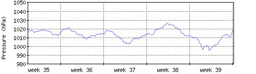 Der blaue Graph zeigt den mittleren Luftdruck, der Bereich zwischen grösstem und kleinstem Druck während des Messintervals ist in hellblau dargestellt. |