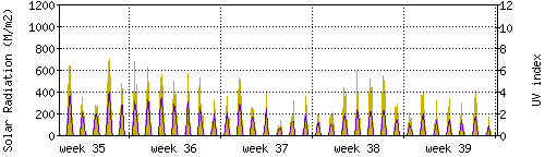 Das goldene Histogramm zeigt die totale Sonnestrahlung in W/m^2, die Skala befindet sich am linken Rand. Die violette Kurve zeigt den UV index, mit der Skala am rechten Rand. Man beachte, dass nach Schneefall die Messwerte nicht zuverlässig sind, weil die Sensoren nicht automatisch vom Schnee befreit werden. |