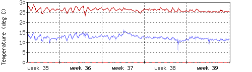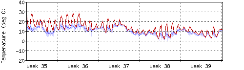 Die rote Kurve zeigt die Innentemperatur,die hellrote Fläche zeigt den Bereichh zwischen höchster und tiefster Temperatur während des Messzeitraums. |