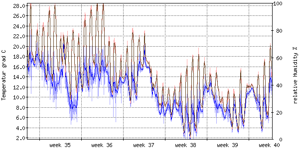 Die rote Kurve zeigt die Temperatur, die hellrote Fläche zeigt den Bereich zwischen höchsten und niedrigsten Temperatur während des Messintervals. Die blaue Kurve zeigt den Taupunkt, also die Temperatur, bei der sich Tau zu bilden beginnt. |