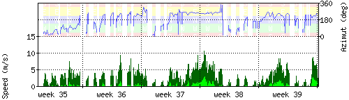 Der untere Teil des Graphen zeigt in hellgrün die mittlere Windgeschwindigkeit, die Spitzengeschwindigkeit ist dunkelgrün dargestellt, die zugehörige Skala findet sich am linken Rand. Der obere Teil des Graphen zeigt das Wind-Azimut in blau, die Skala steht am rechten Rand. |