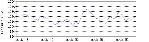 Der blaue Graph zeigt den mittleren Luftdruck, der Bereich zwischen grösstem und kleinstem Druck während des Messintervals ist in hellblau dargestellt. |