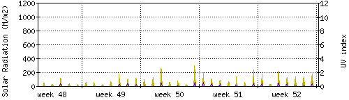 Das goldene Histogramm zeigt die totale Sonnestrahlung in W/m^2, die Skala befindet sich am linken Rand. Die violette Kurve zeigt den UV index, mit der Skala am rechten Rand. Man beachte, dass nach Schneefall die Messwerte nicht zuverlässig sind, weil die Sensoren nicht automatisch vom Schnee befreit werden. |