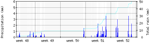 Das blaue Histogram zeigt die totale Niederschlagsmenge (oder deren Wassergehalt) in mm während des Messintervals. |