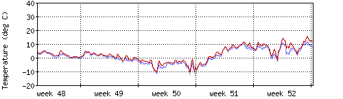 Die rote Kurve zeigt die Temperatur, die hellrote Fläche zeigt den Bereich zwischen höchsten und niedrigsten Temperatur während des Messintervals. Die blaue Kurve zeigt den Taupunkt, also die Temperatur, bei der sich Tau zu bilden beginnt. |