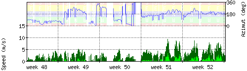Der untere Teil des Graphen zeigt in hellgrün die mittlere Windgeschwindigkeit, die Spitzengeschwindigkeit ist dunkelgrün dargestellt, die zugehörige Skala findet sich am linken Rand. Der obere Teil des Graphen zeigt das Wind-Azimut in blau, die Skala steht am rechten Rand. |