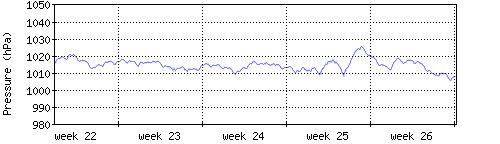 Der blaue Graph zeigt den mittleren Luftdruck, der Bereich zwischen grösstem und kleinstem Druck während des Messintervals ist in hellblau dargestellt. |