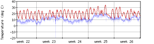 Die rote Kurve zeigt die Innentemperatur,die hellrote Fläche zeigt den Bereichh zwischen höchster und tiefster Temperatur während des Messzeitraums. |