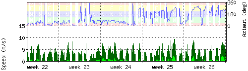 Der untere Teil des Graphen zeigt in hellgrün die mittlere Windgeschwindigkeit, die Spitzengeschwindigkeit ist dunkelgrün dargestellt, die zugehörige Skala findet sich am linken Rand. Der obere Teil des Graphen zeigt das Wind-Azimut in blau, die Skala steht am rechten Rand. |