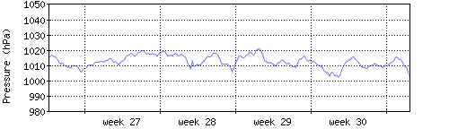 Der blaue Graph zeigt den mittleren Luftdruck, der Bereich zwischen grösstem und kleinstem Druck während des Messintervals ist in hellblau dargestellt. |