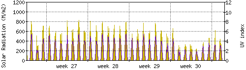 Das goldene Histogramm zeigt die totale Sonnestrahlung in W/m^2, die Skala befindet sich am linken Rand. Die violette Kurve zeigt den UV index, mit der Skala am rechten Rand. Man beachte, dass nach Schneefall die Messwerte nicht zuverlässig sind, weil die Sensoren nicht automatisch vom Schnee befreit werden. |