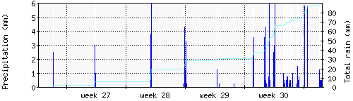 Das blaue Histogram zeigt die totale Niederschlagsmenge (oder deren Wassergehalt) in mm während des Messintervals. |