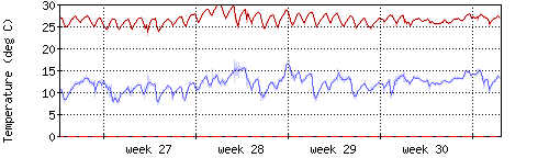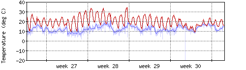 Die rote Kurve zeigt die Innentemperatur,die hellrote Fläche zeigt den Bereichh zwischen höchster und tiefster Temperatur während des Messzeitraums. |