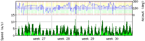 Der untere Teil des Graphen zeigt in hellgrün die mittlere Windgeschwindigkeit, die Spitzengeschwindigkeit ist dunkelgrün dargestellt, die zugehörige Skala findet sich am linken Rand. Der obere Teil des Graphen zeigt das Wind-Azimut in blau, die Skala steht am rechten Rand. |