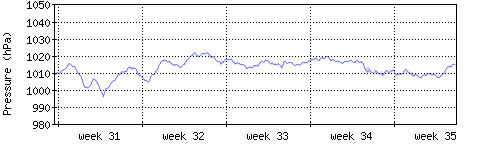 Der blaue Graph zeigt den mittleren Luftdruck, der Bereich zwischen grösstem und kleinstem Druck während des Messintervals ist in hellblau dargestellt. |