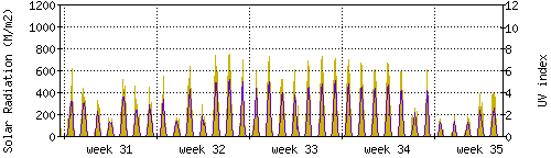 Das goldene Histogramm zeigt die totale Sonnestrahlung in W/m^2, die Skala befindet sich am linken Rand. Die violette Kurve zeigt den UV index, mit der Skala am rechten Rand. Man beachte, dass nach Schneefall die Messwerte nicht zuverlässig sind, weil die Sensoren nicht automatisch vom Schnee befreit werden. |