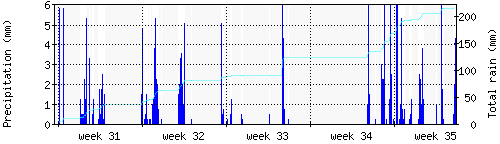 Das blaue Histogram zeigt die totale Niederschlagsmenge (oder deren Wassergehalt) in mm während des Messintervals. |