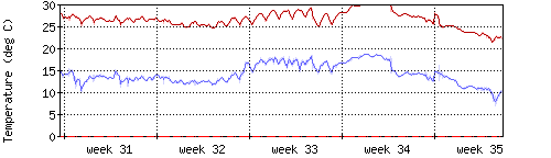 Die rote Kurve zeigt die Innentemperatur,die hellrote Fläche zeigt den Bereichh zwischen höchster und tiefster Temperatur während des Messzeitraums. |