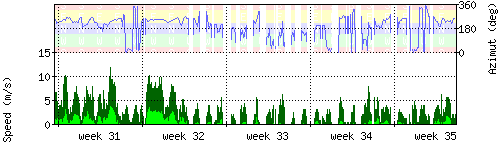 Der untere Teil des Graphen zeigt in hellgrün die mittlere Windgeschwindigkeit, die Spitzengeschwindigkeit ist dunkelgrün dargestellt, die zugehörige Skala findet sich am linken Rand. Der obere Teil des Graphen zeigt das Wind-Azimut in blau, die Skala steht am rechten Rand. |