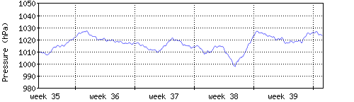 Der blaue Graph zeigt den mittleren Luftdruck, der Bereich zwischen grösstem und kleinstem Druck während des Messintervals ist in hellblau dargestellt. |