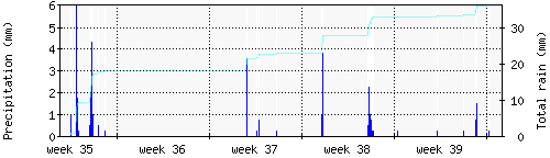 Das blaue Histogram zeigt die totale Niederschlagsmenge (oder deren Wassergehalt) in mm während des Messintervals. |