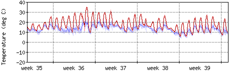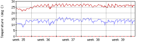 Die rote Kurve zeigt die Innentemperatur,die hellrote Fläche zeigt den Bereichh zwischen höchster und tiefster Temperatur während des Messzeitraums. |
