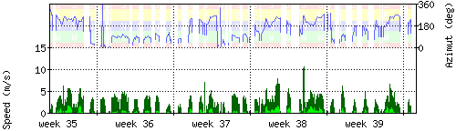 Der untere Teil des Graphen zeigt in hellgrün die mittlere Windgeschwindigkeit, die Spitzengeschwindigkeit ist dunkelgrün dargestellt, die zugehörige Skala findet sich am linken Rand. Der obere Teil des Graphen zeigt das Wind-Azimut in blau, die Skala steht am rechten Rand. |