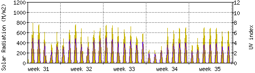 Das goldene Histogramm zeigt die totale Sonnestrahlung in W/m^2, die Skala befindet sich am linken Rand. Die violette Kurve zeigt den UV index, mit der Skala am rechten Rand. Man beachte, dass nach Schneefall die Messwerte nicht zuverlässig sind, weil die Sensoren nicht automatisch vom Schnee befreit werden. |
