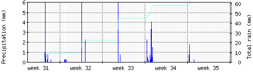 Das blaue Histogram zeigt die totale Niederschlagsmenge (oder deren Wassergehalt) in mm während des Messintervals. |