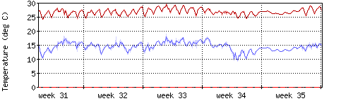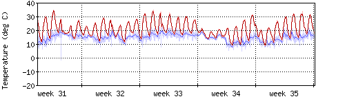 Die rote Kurve zeigt die Innentemperatur,die hellrote Fläche zeigt den Bereichh zwischen höchster und tiefster Temperatur während des Messzeitraums. |