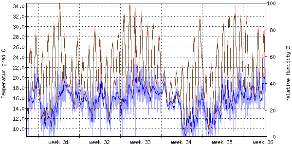 Die rote Kurve zeigt die Temperatur, die hellrote Fläche zeigt den Bereich zwischen höchsten und niedrigsten Temperatur während des Messintervals. Die blaue Kurve zeigt den Taupunkt, also die Temperatur, bei der sich Tau zu bilden beginnt. |