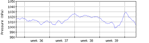Der blaue Graph zeigt den mittleren Luftdruck, der Bereich zwischen grösstem und kleinstem Druck während des Messintervals ist in hellblau dargestellt. |